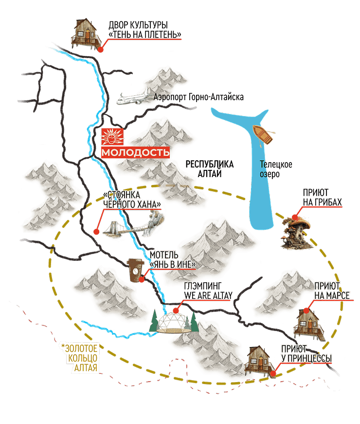 Сердцем нашей экосистемы является культурная турбаза «Молодость в Манжероке», она находится на месте турбазы «Юность», которая была одной из первых в стране и открылась в 1958 году. Важной частью нашей работы является установление связи между прошлым и настоящим, между местными традициями и нашим современным образом жизни и мысли.